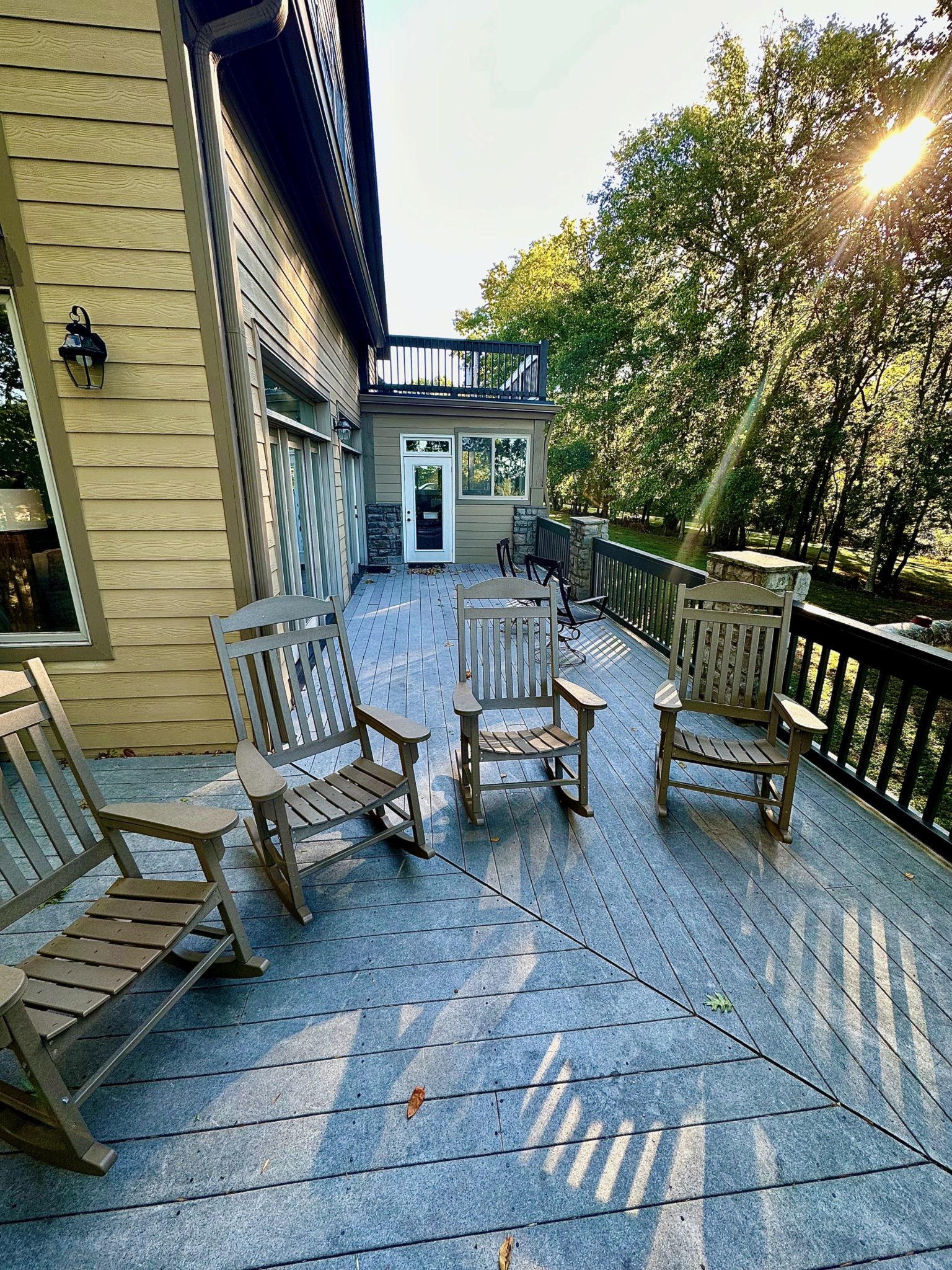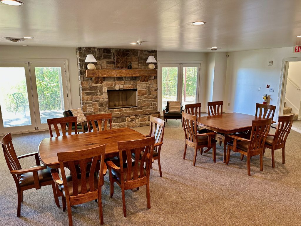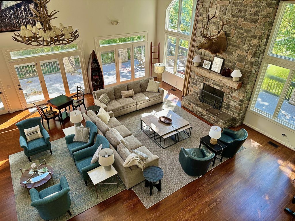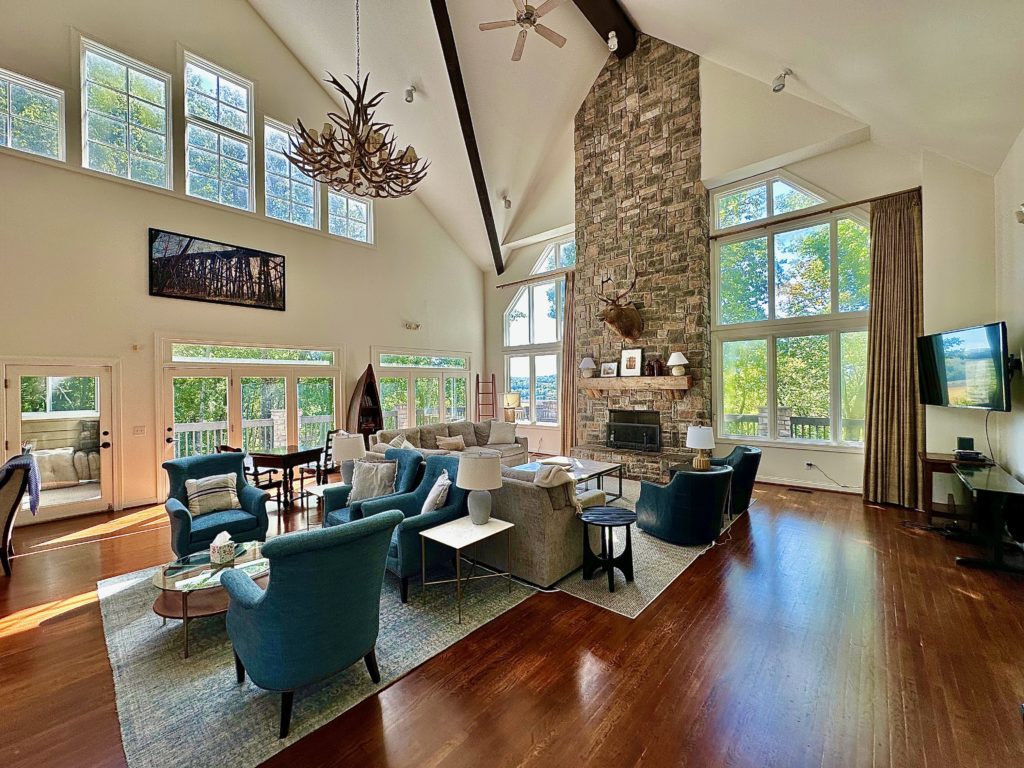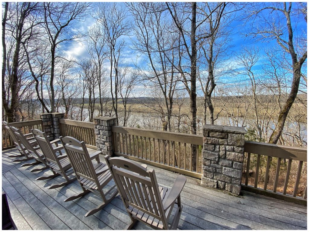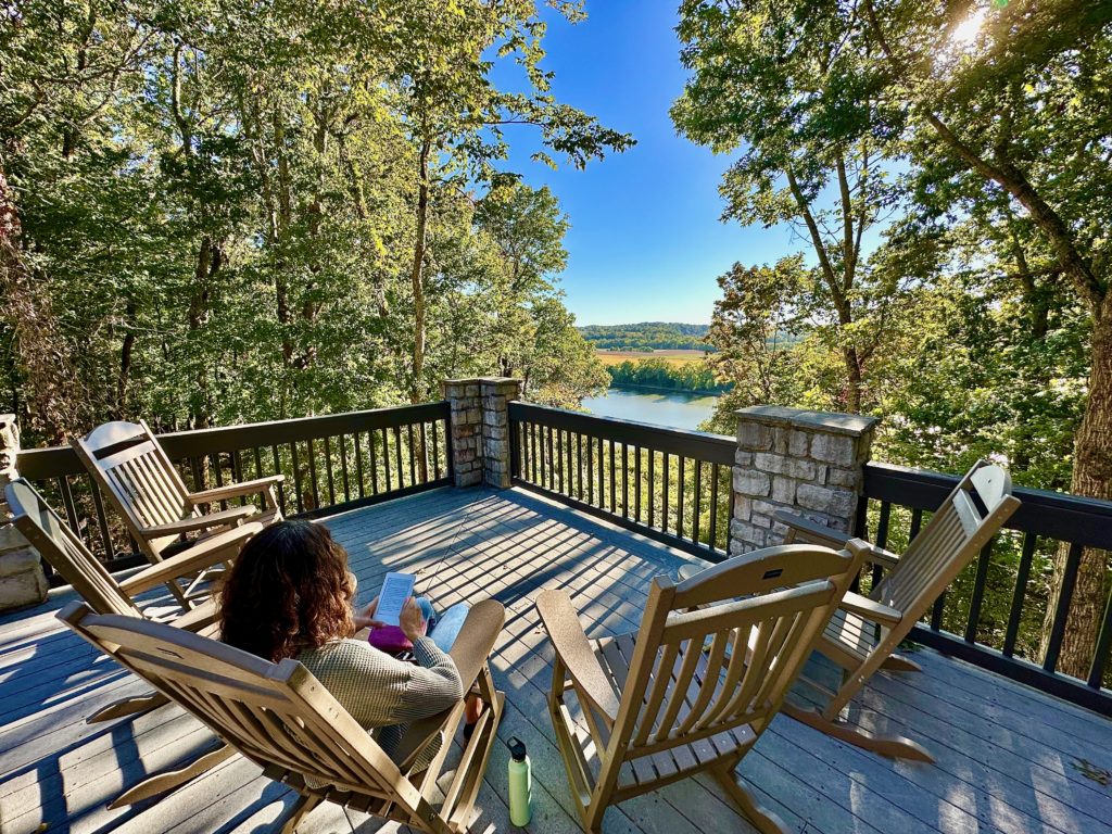 Beautiful front of lodgeLarge great room with plenty of seatingCozy entranceDining table for 12Sun RoomWrap around porch with great views of riverFire pitDownstairsDownstairsPrivate porch upstairsPrayer/Reading Room6 bedrooms with queen beds6 bedrooms with two twin bedsSwing and grilling areaWinter at The Hiding PlaceHistoric train trestlePerfect for morning coffeeOpen kitchenLess than 30 minutes from quaint downtown Clarksville