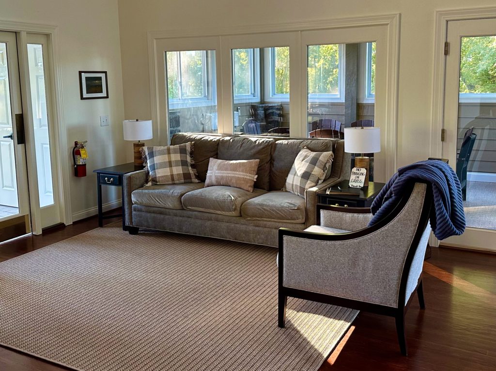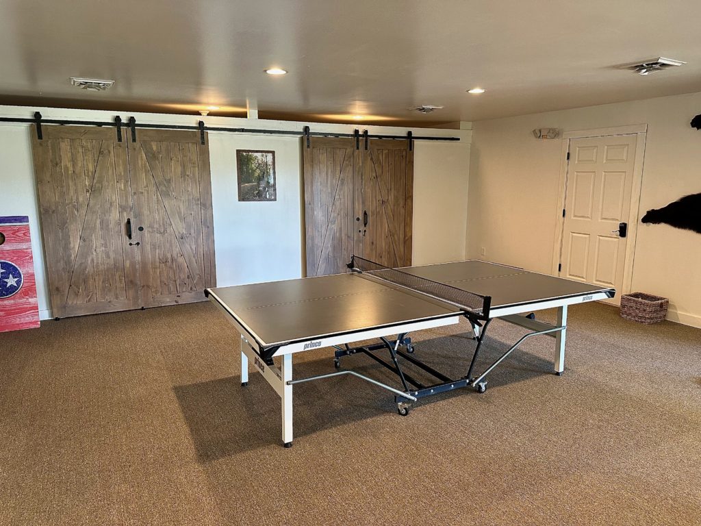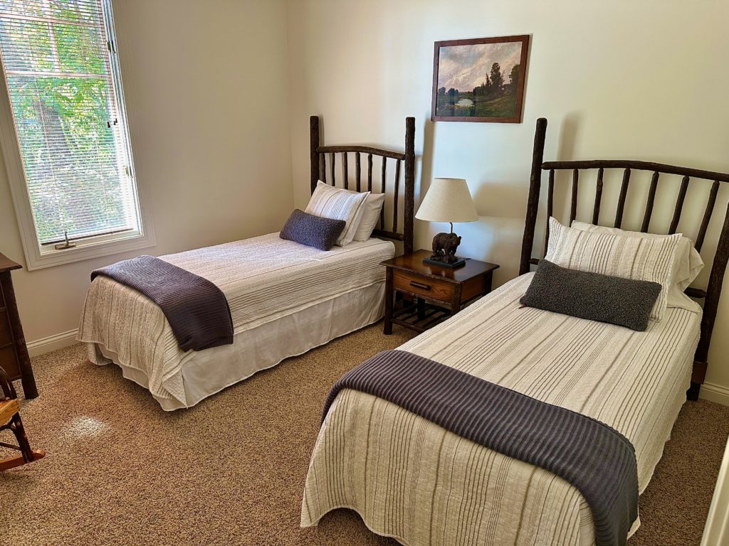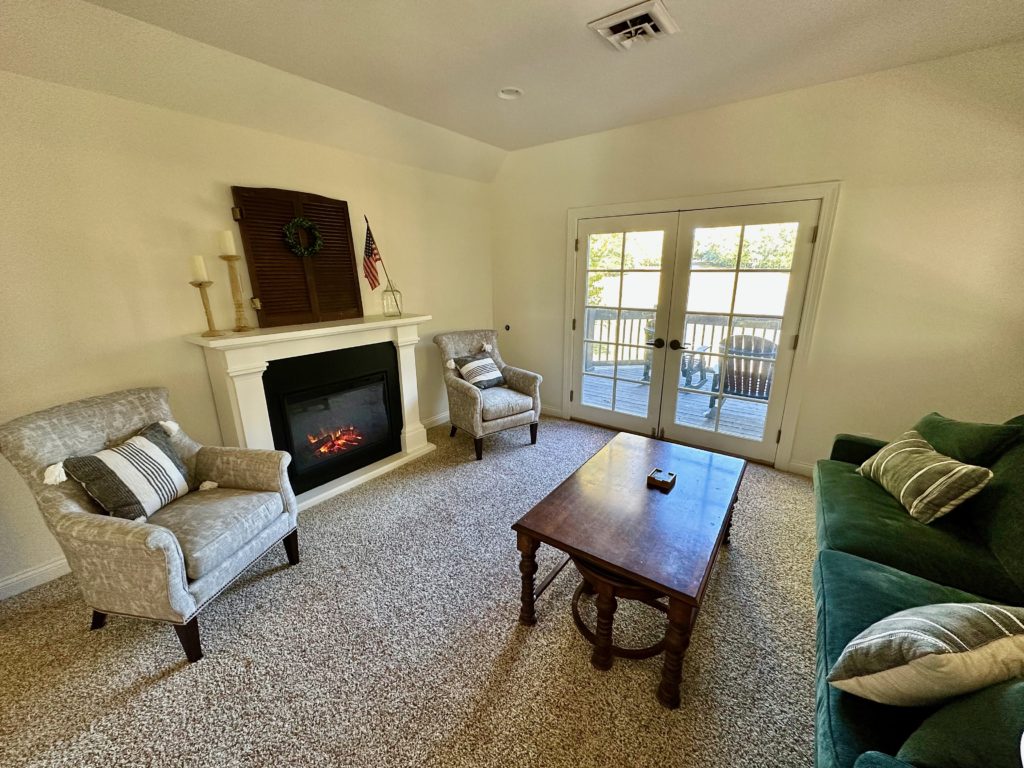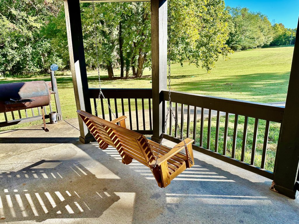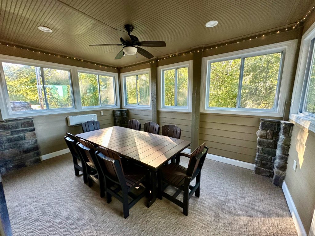 Beautiful front of lodgeLarge great room with plenty of seatingCozy entranceDining table for 12Sun RoomWrap around porch with great views of riverFire pitDownstairsDownstairsPrivate porch upstairsPrayer/Reading Room6 bedrooms with queen beds6 bedrooms with two twin bedsSwing and grilling areaWinter at The Hiding PlaceHistoric train trestlePerfect for morning coffeeOpen kitchenLess than 30 minutes from quaint downtown Clarksville